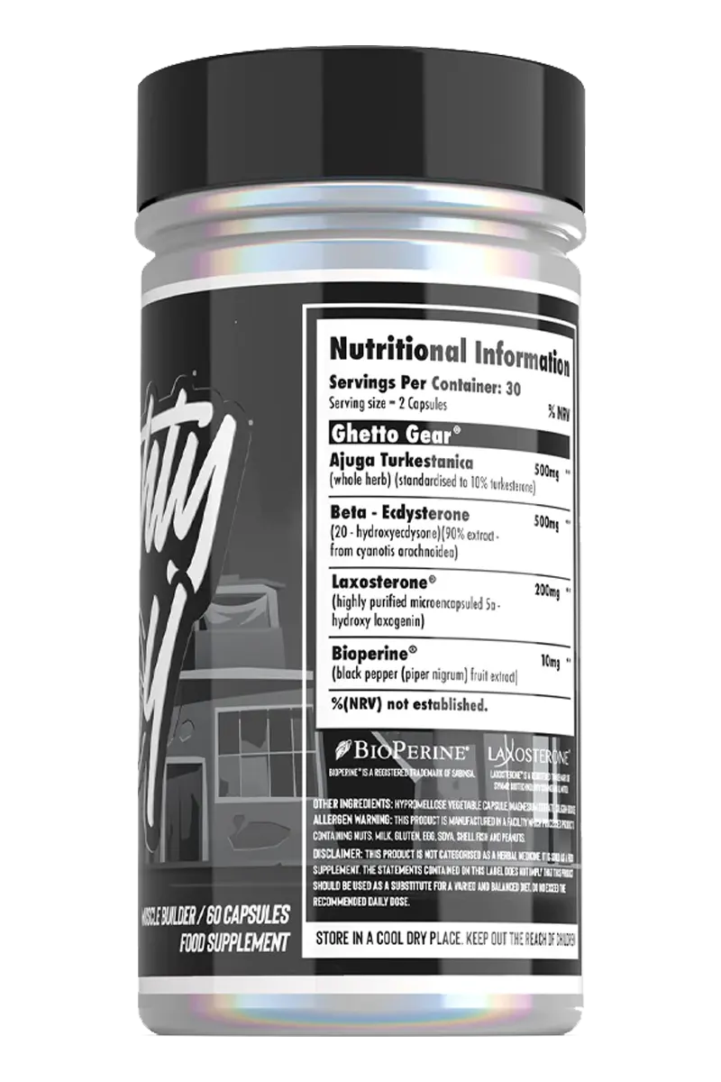 Ghetto Gear® er en førsteklasses blanding av plantesteroider inkludert en effektiv dose Turkesteron. Ghetto Gear® er for deg som vil øke muskelmassen og redusere kroppsfett. Ghetto Gear® gir økt styrke + ytelse, en reduksjon i kortisol, forbedret insulinfølsomhet, forbedret regulering av testosteron og en økning i muskelproteinsyntese. Ghetto Gear® inneholder den patenterte ingrediensen BioPerine® som er inkludert for å forbedre absorpsjonen av plantesteroidene.
